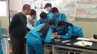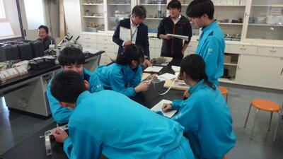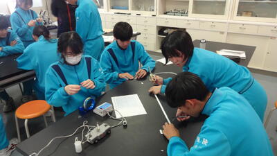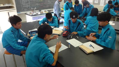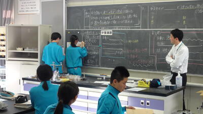 3年生理科の授業の様子です。単元名はエネルギー。この日は「物体の運動」→「水平面上での物体の運動」について学習しました。力のはたらきき方と運動の様子の関係について、水平面上においた台車に一定の力を加えて動かす実験を元にして理解させる内容でした。思考のポイントに着目し、自力解決する課題設定をする。正しく実験を行い、速さの変化を正しく読み取り、記録する等、各グループごとに知恵を絞り合い、和やかな雰囲気の中、真剣に学ぶ姿が見られました♪