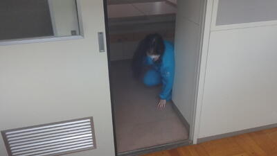 その後、校舎内に戻り、「煙体験」を行いました。消防署員の方から、避難時の姿勢、煙の危険性など、避難時における行動について学び、人工煙(無害)が充満した暗い部屋に一人ずつ入りました。それぞれハンカチ等で口を覆い、低い姿勢で、壁伝いに歩き、出口を探しました。